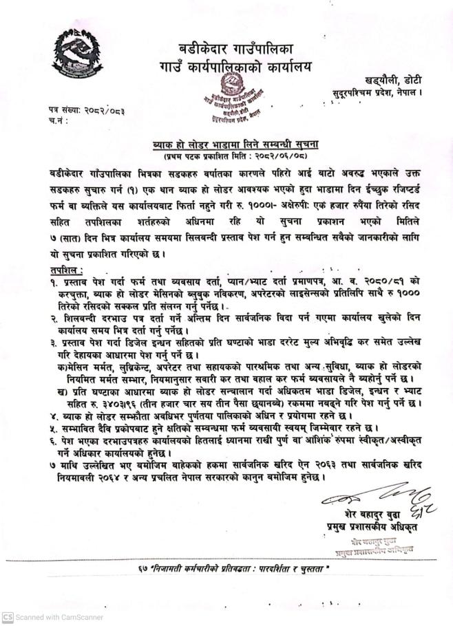 ब्याक हो लोडर भाडामा लिने सम्बन्धी सूचना !
