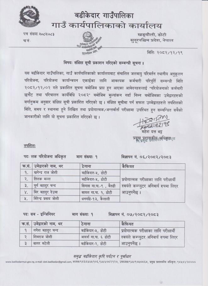 संक्षिप्त सूचि प्रकाशन गरिएको सम्बन्धी सूचना !