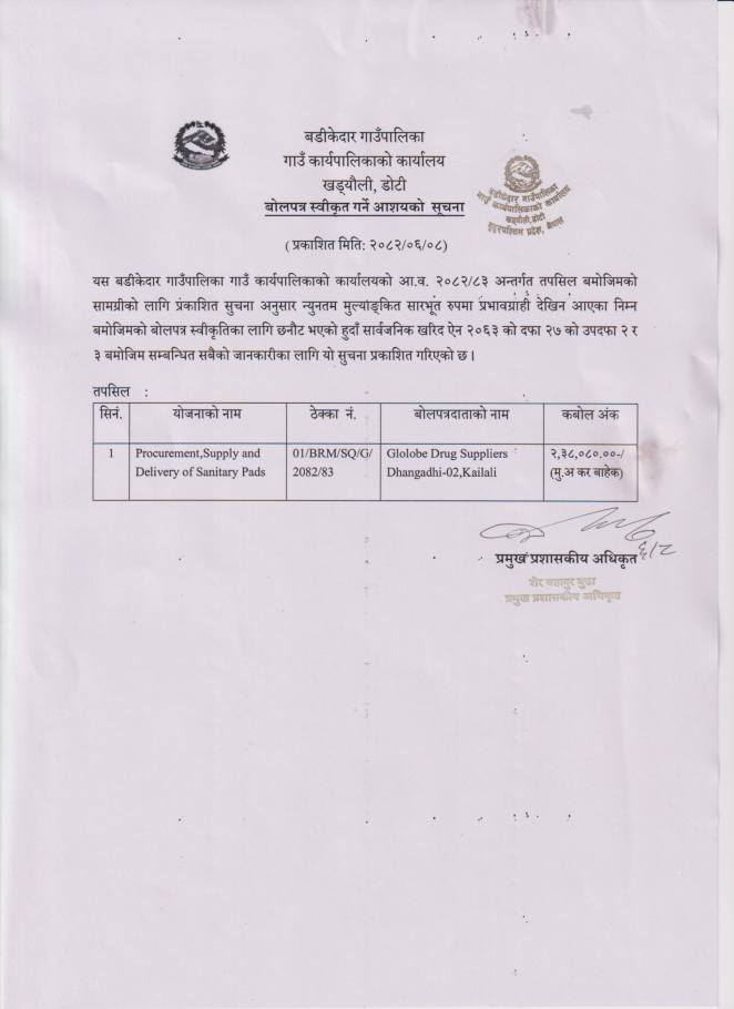 » वोलपत्र स्विकृत गर्ने आशयको सूचना !