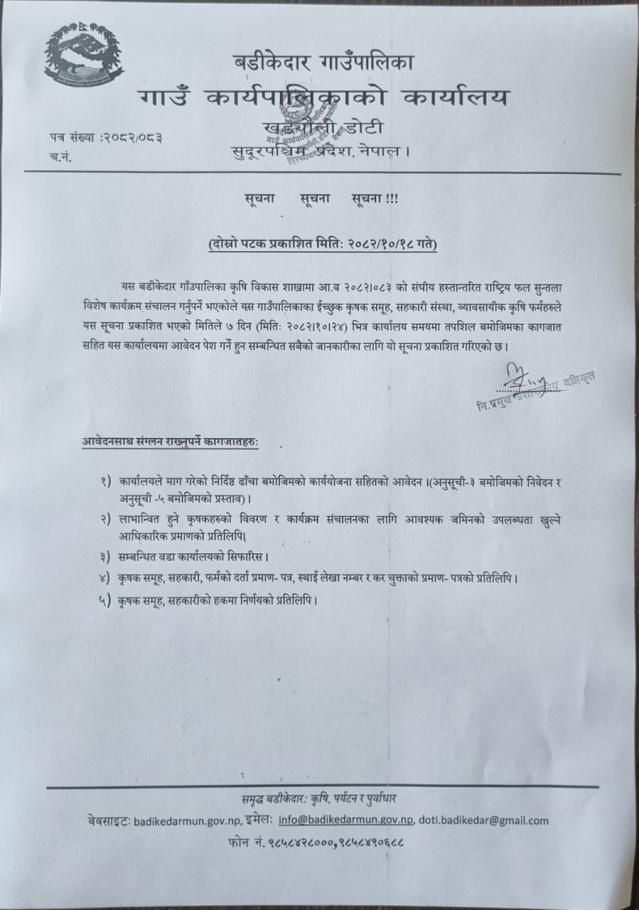 अदुवा वेसार बालीको नयाँ पकेट स्थापना कार्यक्रम र राष्ट्रिय फल सुन्तला विशेष कार्यक्रमको प्रस्ताव पेश गर्ने सम्बन्धी दोस्रो पटक प्रकाशित सूचना !