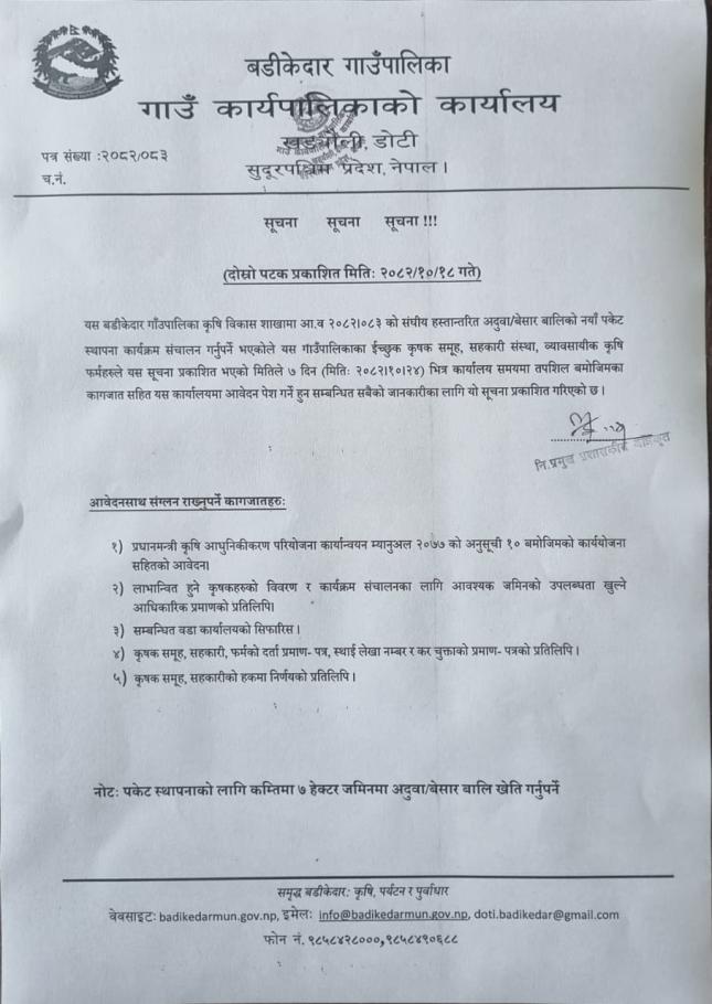 » अदुवा वेसार बालीको नयाँ पकेट स्थापना कार्यक्रम र राष्ट्रिय फल सुन्तला विशेष कार्यक्रमको प्रस्ताव पेश गर्ने सम्बन्धी दोस्रो पटक प्रकाशित सूचना !
