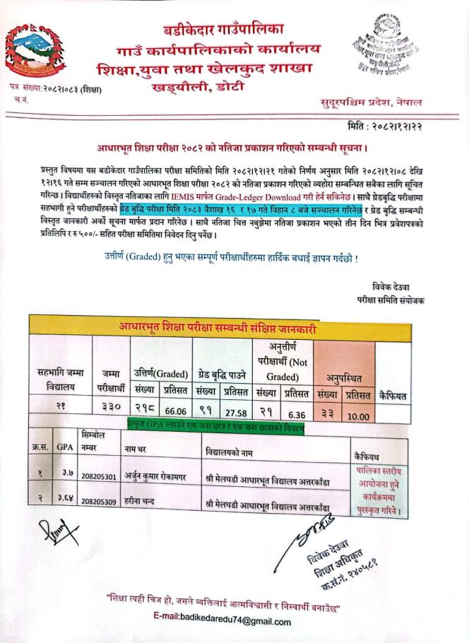 » आधारभूत तह परीक्षा २०८२ को नतिजा प्रकाशन गरिएको सम्बन्धी सूचना !
