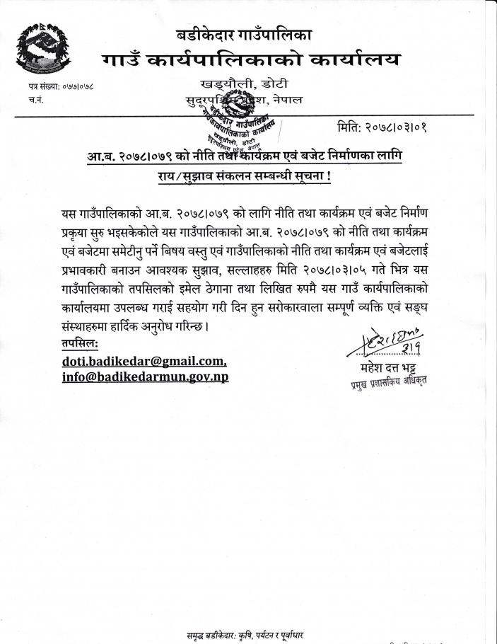 आ.ब. २०७८।०७९ को नीति तथा कार्यक्रम एवं बजेट निर्माणका लागि राय÷सुझाव संकलन सम्बन्धी सूचना !