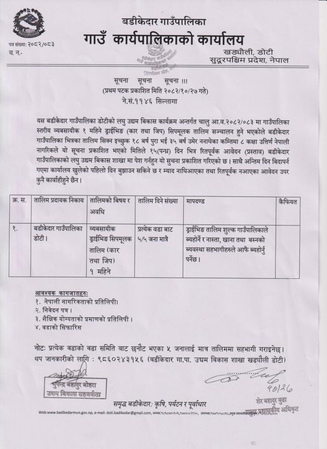 » व्यावसायिक ड्राइभिङ तालिम सञ्चालन सम्बन्धी सूचना !