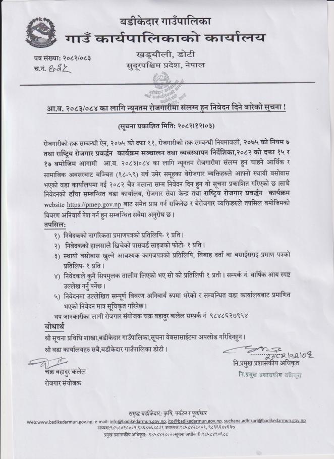 » आ.ब. २०८३/०८४ का लागि न्यूनतम रोजगारीमा संलग्न हुन निवेदन दिने बारेको सूचना !